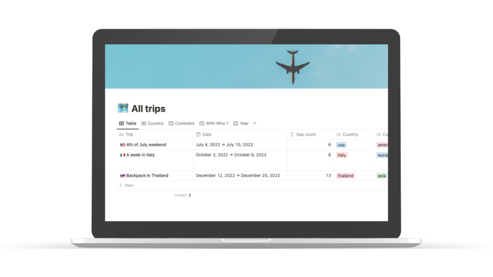 - All trip database with trip dates, day count, country tag, continent tag, ‘with whom’ tag, year tag, and more